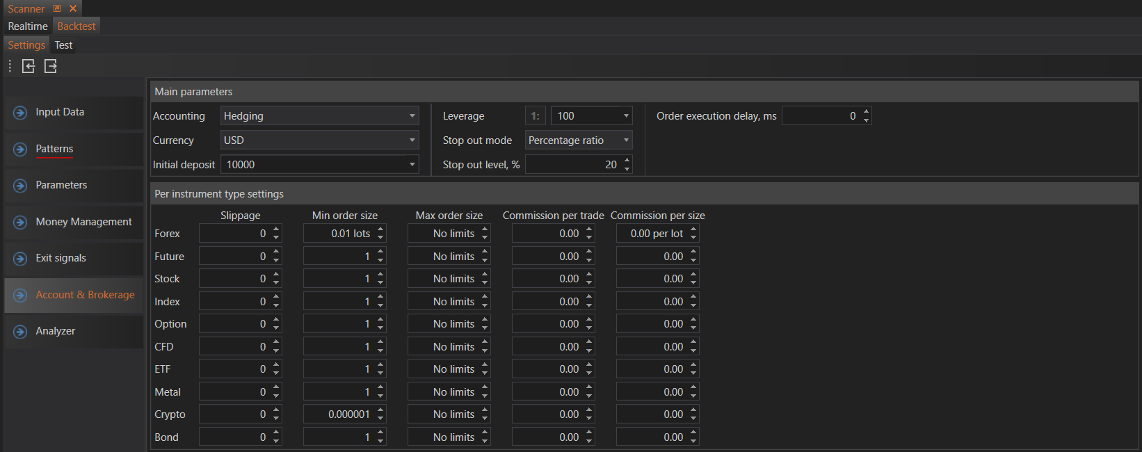 The Account & Brokerage section in the Scanner module settings allows users to simulate brokerage account conditions during backtesting. This ensures that the backtest results are as realistic as possible by incorporating key account parameters and brokerage-specific settings.