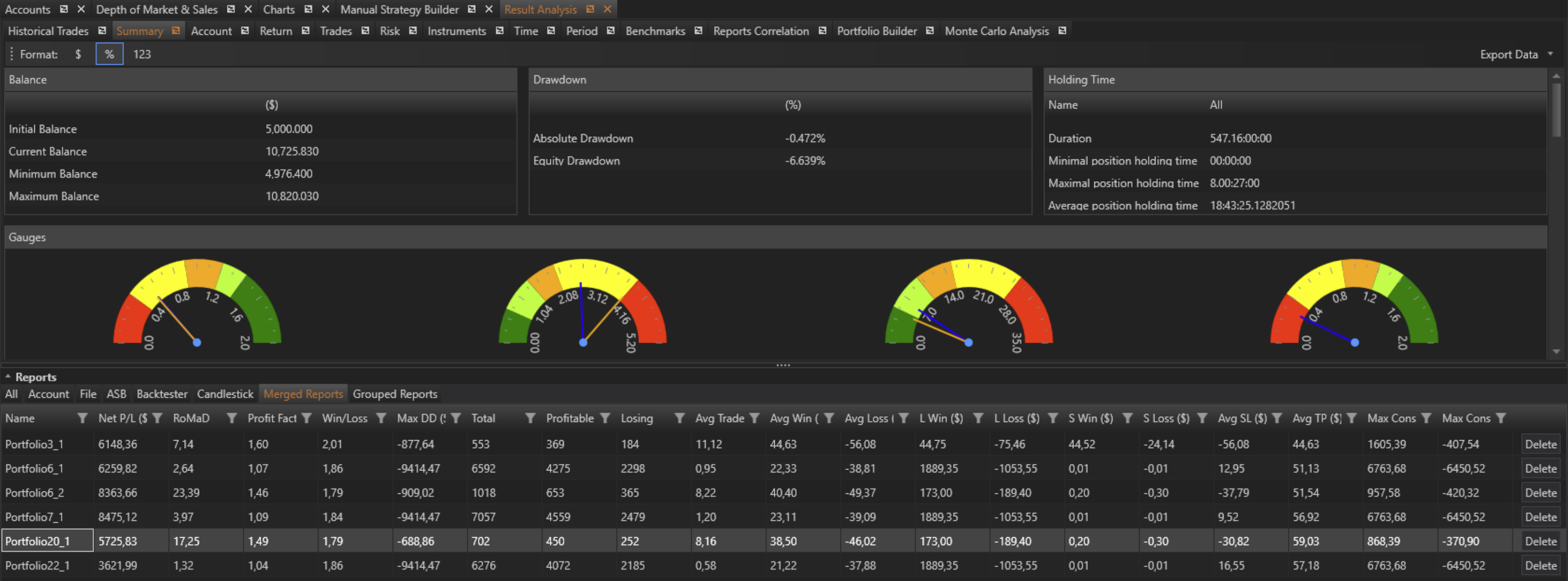 The Progress tab in the Portfolio Builder of the Result Analysis module is the central point for initiating and tracking the portfolio construction process. By following the steps to select reports, configure settings, and launch the builder, users can efficiently create optimized portfolios. The resulting portfolios are stored in the Merged Reports tab, where they can be further analyzed using the comprehensive tools available in the Result Analysis module. This functionality provides traders with the ability to systematically construct and evaluate portfolios, enhancing their decision-making and strategy optimization efforts.