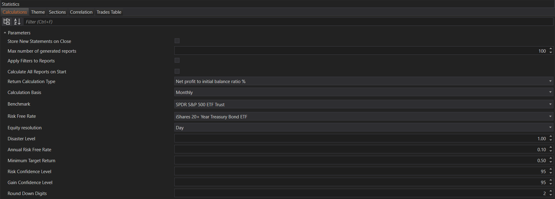 The Calculations tab in the Properties section of the Result Analysis module provides various settings that influence how trading reports are calculated and displayed. These settings allow users to customize their analysis based on specific parameters and preferences.