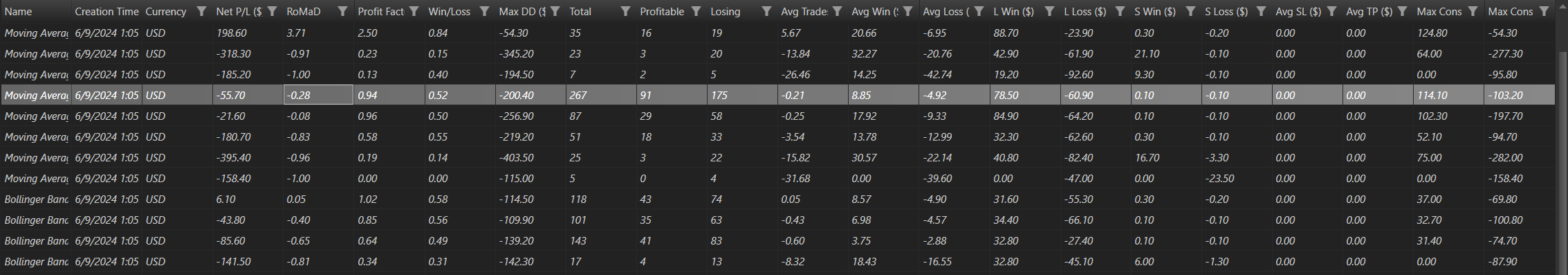 The Reports Grid in the Result Analysis module provides a detailed and comprehensive view of trading performance through various columns. These columns include general information about the report, key performance metrics, trade statistics, details of the largest and smallest trades, and data on stop loss, take profit, and consecutive trades. This extensive information helps users to thoroughly analyze and understand their trading strategies and performance.