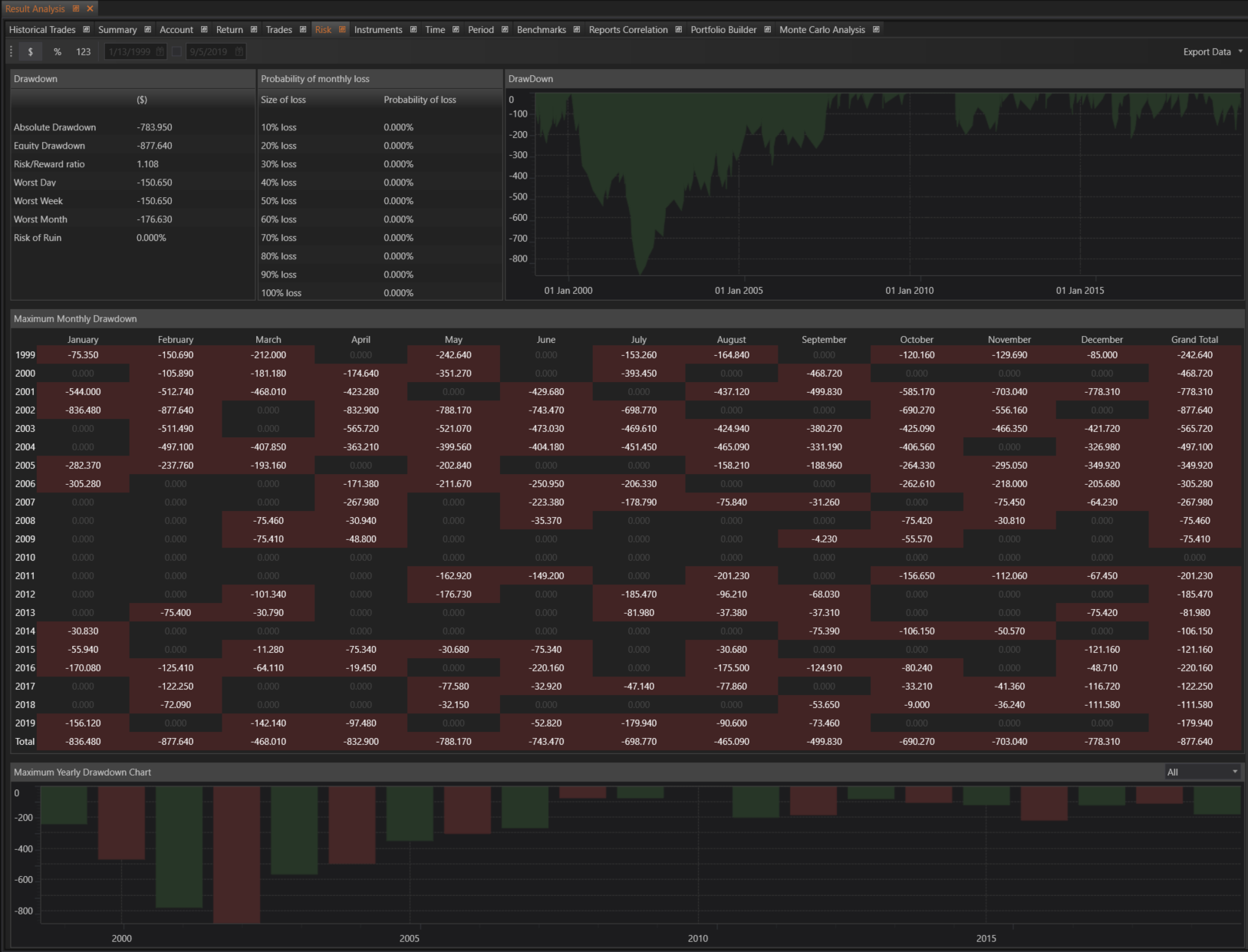 - Probability of Monthly Loss: Shows the likelihood of various levels of monthly losses, helping traders understand the risk of adverse outcomes.