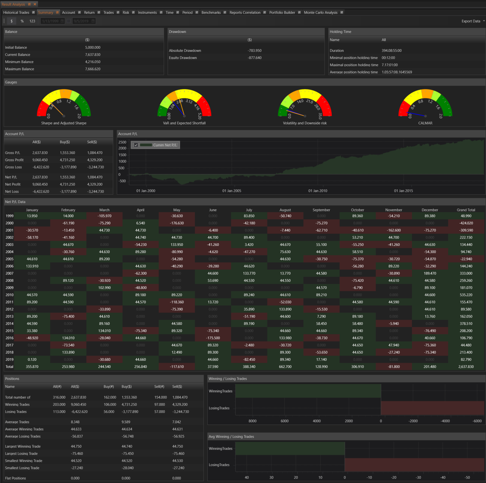A detailed table presents Net P/L data grouped by year and month, allowing for a time-based analysis of performance.