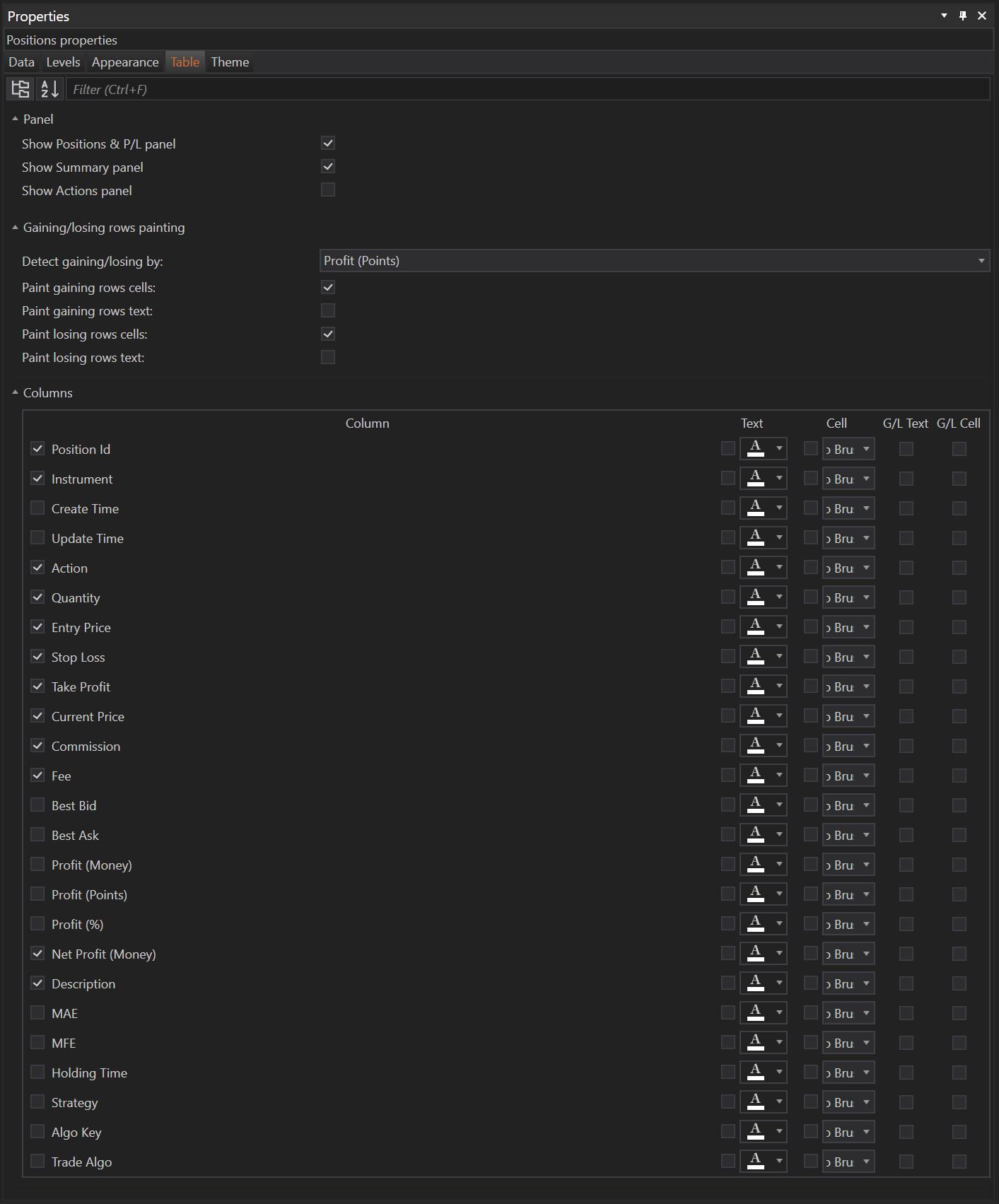 The Positions module in the FinStudio application can be customized through the Properties section. This section is divided into five main tabs: Data, Levels, Appearance, Table, and Theme. Each tab is tailored to enhance the user interface and operational efficiency, allowing for a personalized trading experience.