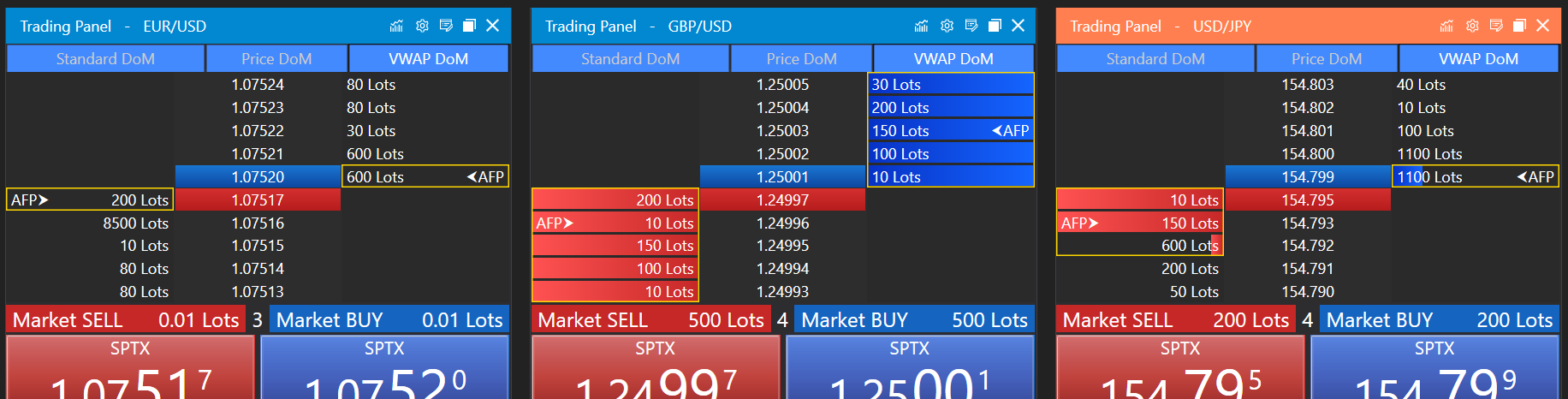 - Functionality: When a trade quantity is set and exceeds the available volume at the best bid or ask, VWAP DoM visually represents the total price impact of such an order through a painted rectangle. This rectangle encompasses the volume across various price levels that the order would fill. Additionally, an Average Fill Price (AFP) marker is displayed, providing clarity on the weighted average price at which the order would execute.