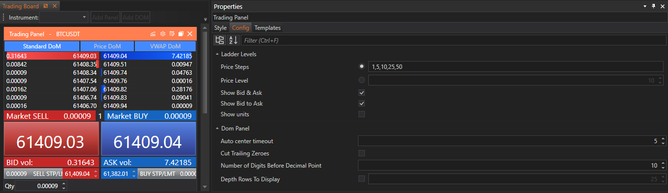 The Config Tab in FinStudio's Tradingboard Trade Panel is an essential tool for traders seeking to optimize their trading interface to better suit their trading habits and market strategies. By offering detailed control over various parameters and behaviors of the trading panel, including ladder levels and DoM settings, this tab not only enhances the functionality of the trading environment but also increases its adaptability to meet individual trader needs. This level of customization ensures that traders can effectively manage their trading activities, contributing to better decision-making and ultimately more successful trading outcomes.