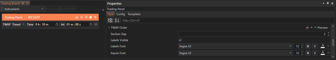 This section provides options to control the visibility and style of labels and input fields, ensuring that the TWAP settings are both functional and visually integrated with the trader’s preferences.