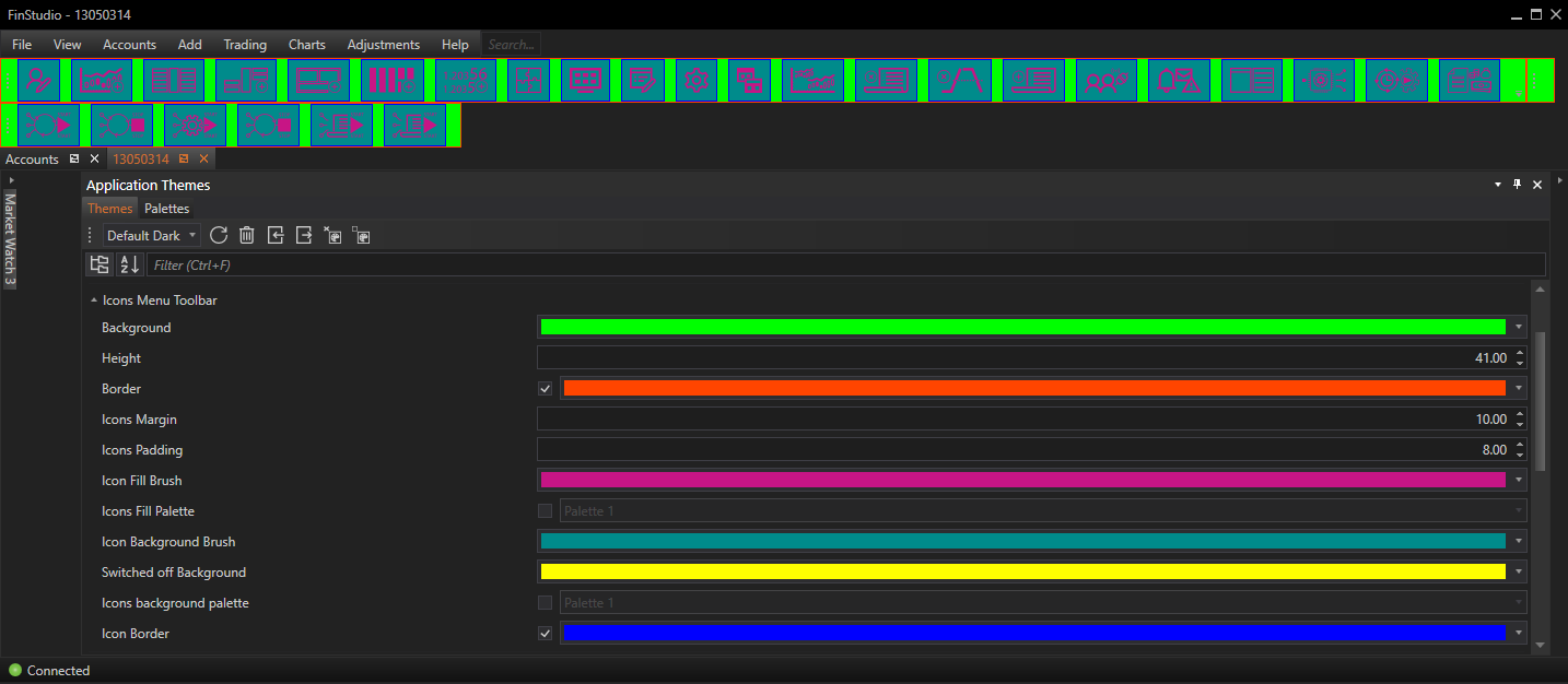 The Icons Menu Toolbar properties section in FinStudio's Application Themes module provides detailed control over the visual presentation of icon-based toolbars, enhancing both the functionality and aesthetic integration within the trading platform. By allowing such a high degree of customization, FinStudio empowers users to create a personalized and visually cohesive trading environment. These settings ensure that every aspect of the user interface can be finely tuned to meet individual preferences, contributing to a more engaging and productive user experience.