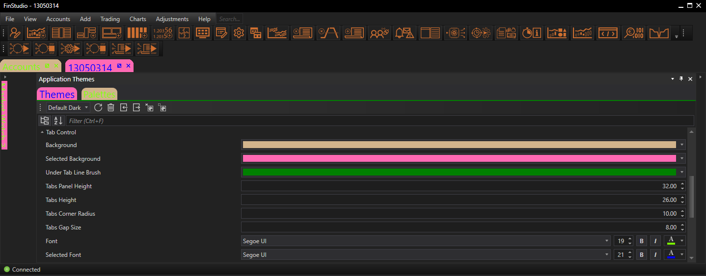 The Tab Control properties section within the Application Themes module of FinStudio provides essential customization options for the tabs used across the trading platform. Tabs are instrumental in organizing content efficiently, allowing users to navigate through various sections and modules swiftly. Customizing these elements enhances usability, ensures visual coherence, and improves the overall navigation experience.