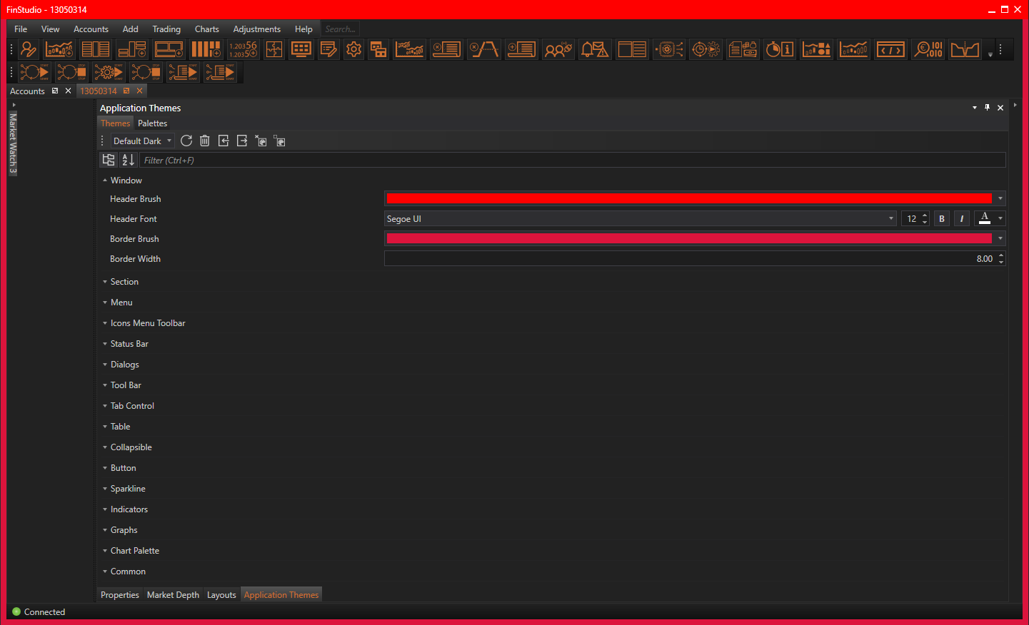 In FinStudio's Application Themes module, the Window properties section provides users with detailed control over the visual elements related to the main application window. This section is crucial for setting the tone and style of the user interface, allowing for a personalized appearance that can enhance usability and aesthetic appeal.