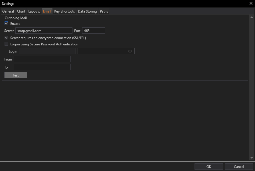 The Email settings tab is crucial for users who need reliable and secure communication from their trading application. Whether it’s for receiving alerts about critical market events, getting trade execution confirmations, or regular reports, setting up this tab correctly ensures that all communications are timely and secure. By meticulously configuring each component of the Email settings, users can enhance their trading strategy, staying informed and responsive to new information as soon as it becomes available.